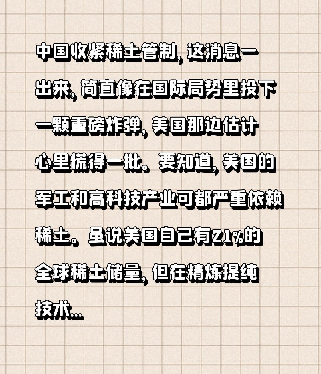 中国收紧稀土管制,这消息一出来,简直像在国际局势里投下一颗重磅炸弹,美国那边估计心里慌得一批。要知道,美国的军工和高科技产业可都严重依赖稀土。虽说美国自己有21%的全球稀土储量,但在精炼提纯技术上,跟中国比起来就是小巫见大巫。中国掌控全球90%以上的稀土精炼产能,还手握相关专利,有完整产业链。之前中国稍微管控一下中高端磁体产品出口,美国国内稀土磁体价格就飙升几十倍,供应链差点崩溃。 这次收紧管制,美国两大支柱产业估计又得面临一场大考验。后续美国会怎么应对?中美在稀土领域还会有怎样的博弈?中国的稀土政策是否还会有新变化? 中国对美稀土 美国稀土需求 中美稀土之争 中国对美稀土 稀土出口限制 美国稀土需求 中美稀土之争 出口稀土 稀土出口禁令 美国稀土依赖