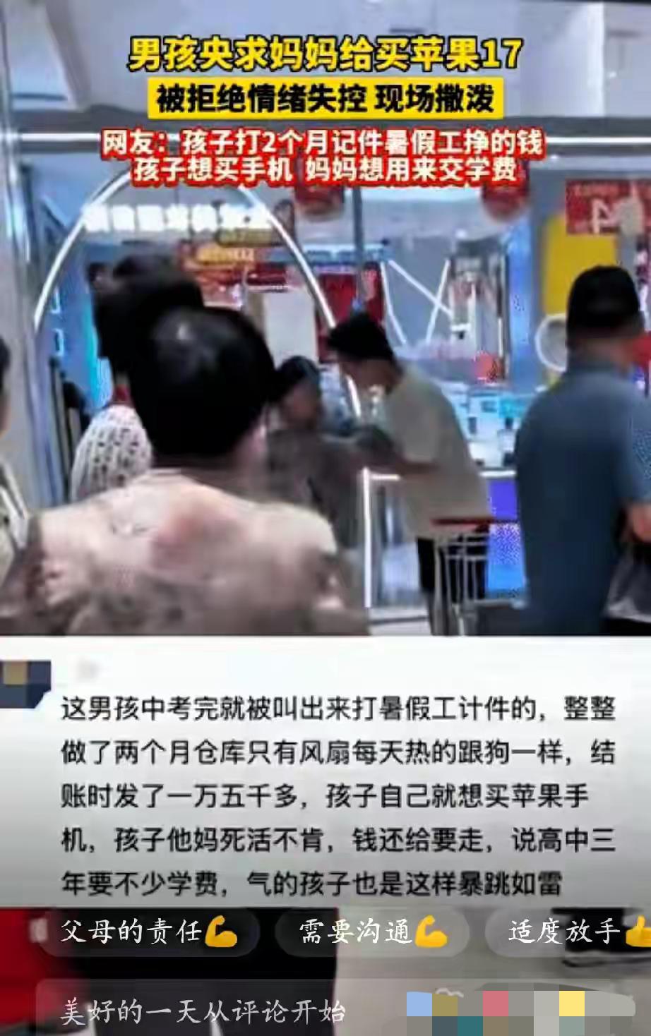 孩子血汗钱买手机被拦?“为你好”别变成上进心的冷水! 河南男孩那句“我自己挣的钱为啥不能买”,喊碎了多少人的心。中考完蹲仓库干俩月计件工,风扇吹不散暑气,衣服湿了又干,1.5万是实打实的血汗,也是他想买苹果17的底气。 妈妈怕学费不够硬把钱收了,初衷没错,可错得离谱。这钱不是家长给的,是孩子靠劳动换的——专家早说过,让孩子支配劳动所得,才能懂珍惜、立金钱观。他没躺平要手机,是靠自己拼,这份主动劲儿本该夸,却被“为你好”泼了冷水。 说白了,孩子要的不是手机,是努力被尊重。要是自己挣的钱都做不了主,下次谁还愿意主动吃苦?换作你,会让孩子分一部分钱圆心愿吗?