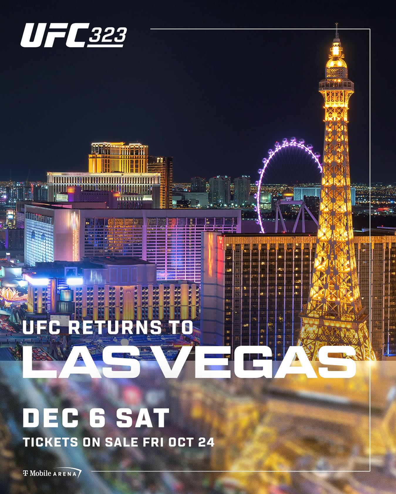 虎扑10月11日讯今日,UFC官方宣布:我们重返世界格斗之都UFC323赛事将于12月6日在拉斯维加斯举办!