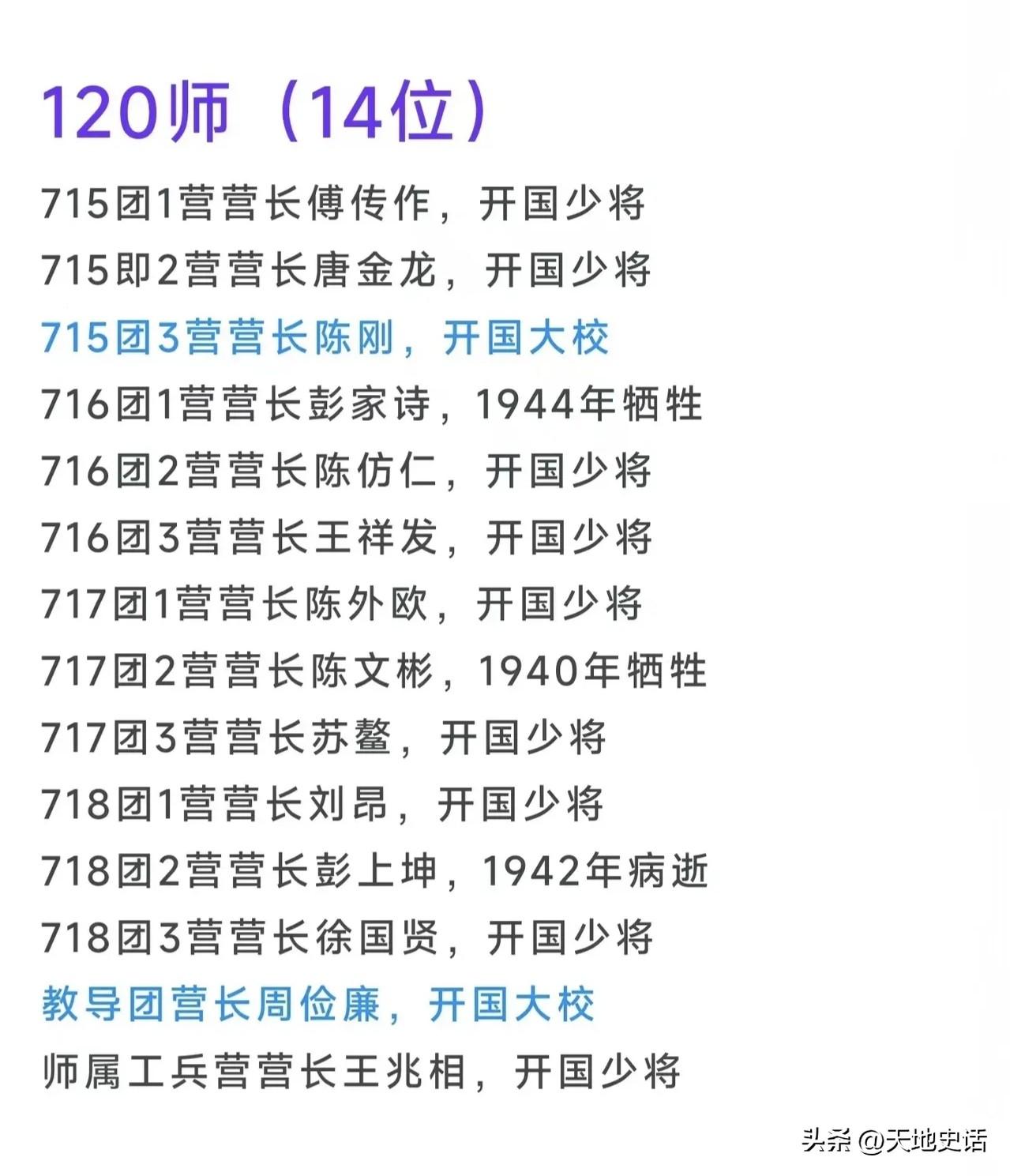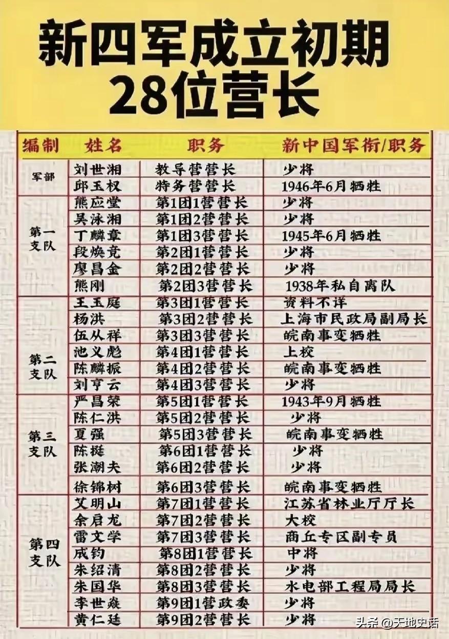 八路军3个师和新四军,成立初期的营长 八路军3个师,和新四军级别相当。成立初期的营长对比。抗战初期的营长多数开国少将,也有大校。少数营长开国中将。 115师19个营,比其他师多一个独立团。 曾国华、梁兴初、张仁初3人中将军衔。 刘德明、郝世英、刘国清、季光顺4位营长牺牲。 688团营长王德荣叛逃。 120师14个营。 彭家诗、陈文彬2位团长牺牲。 129师15个营 孔庆德、皮定均2位团长开国中将。 赵崇德、丁思林、易良品、郭国言、谢家庆5位营长牺牲。 772团团长叶成焕和3位营长全部牺牲,是八路军最能打的一个团。 新四军28个营,不少干部由八路军支援过来。 成钧1位中将。 伍从群、陈麟振、夏强、徐锦树4位营长皖南事变牺牲。 邱玉权、丁麟章、严昌荣3位营长牺牲。