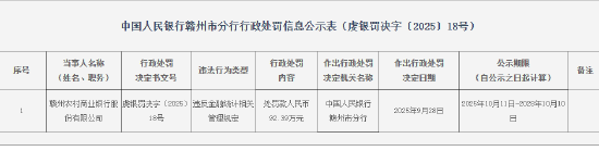 赣州农商银行被罚92.39万元:违反金融统计相关管理规定