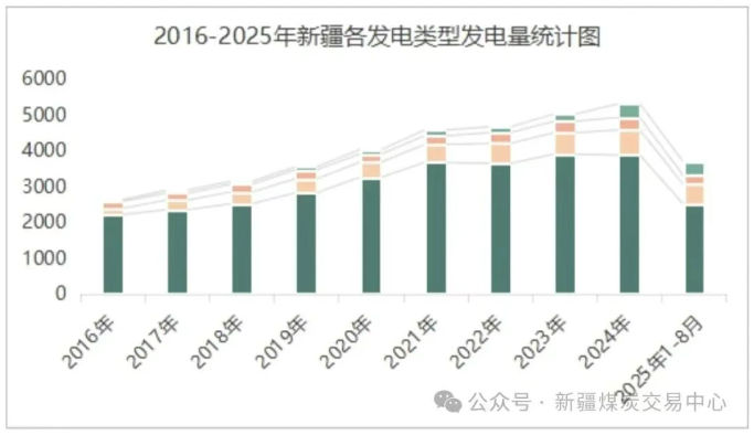 煤电方面:2025年1-8月,新疆电力系统运行呈现“总量稳增、结构优化”的总体特征。全区累计发电量3697.42亿千瓦时,同比增长2.3%。从电力结构看,传统火电发电量为2516.2亿千瓦时,同比下降1.5%,显示其在能源体系中的主导作用正逐步调整;与此同时,清洁能源发电整体增长显著,其中太阳能发电量达383.03亿千瓦时,同比大幅增长33.8%,成为增长最快电源;风力与水力发电分别实现543.7亿千瓦时和254.5亿千瓦时,同比分别增长3.6%和2.6%。