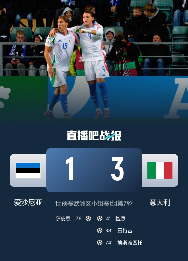 四连胜!意大利3-1爱沙尼亚小基恩破门后伤退多纳鲁马送礼
