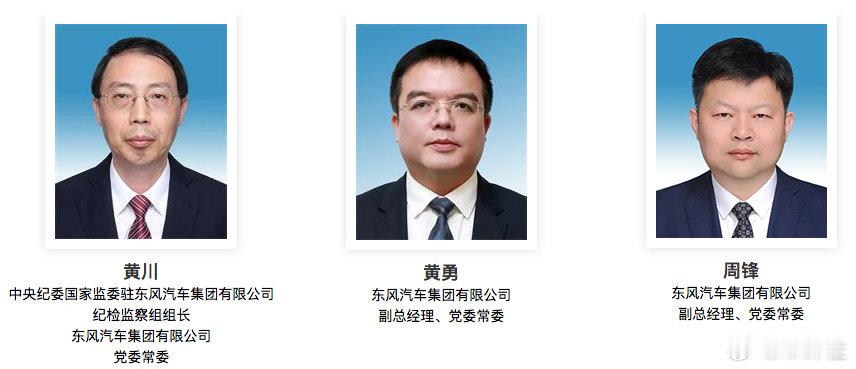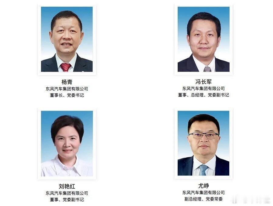 本次冯长军任东风汽车集团有限公司董事、总经理、党委副书记职务后,东风汽车集团有限公司“领导团队”由董事长、党委书记杨青;董事、党委副书记刘艳红;董事、总经理、党委副书记冯长军;副总经理、党委常委尤峥;中央纪委国家监委驻东风汽车集团纪检监察组组长、东风汽车集团党委常委黄川;副总经理、党委常委黄勇;副总经理、党委常委周锋共计7名成员组成。其中,周锋于今年7月22日被任命为东风汽车集团有限公司副总经理、党委常委。