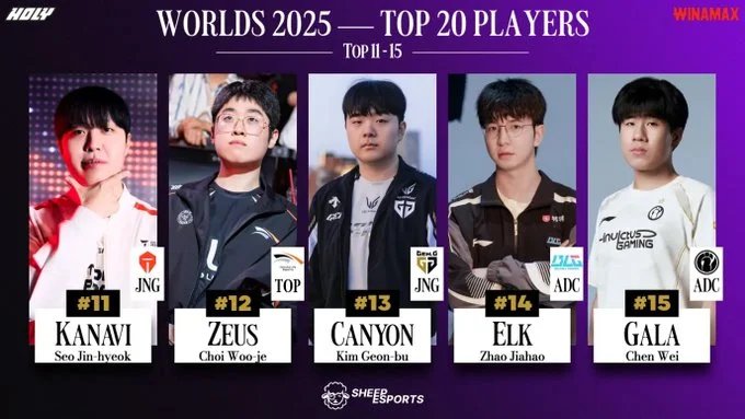 虎扑10月12日讯SheepEsports宣布将发布Top20选手名单,今日揭露第11-15名,排名如下:
