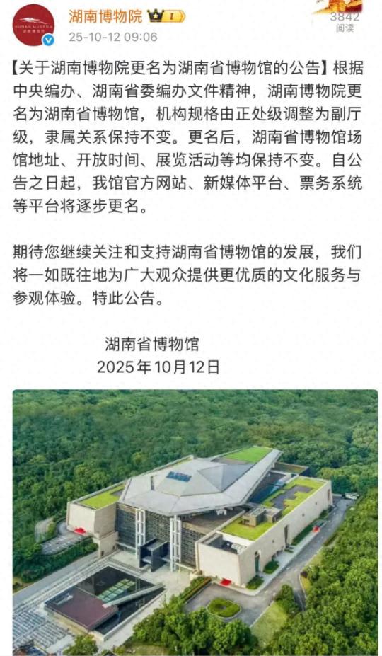 长沙晚报掌上长沙10月12日讯(全媒体记者任波)12日,文博领域传来一则引人关注的消息:据新浪微博@湖南博物院发布公告,即日起“湖南博物院”更名为“湖南省博物馆”,同时机构规格由正处级调整为副厅级。此次更名与升级,标志着这家承载着湖湘文明的重要文化殿堂,在机构定位与事业发展上迈入了新的阶段。