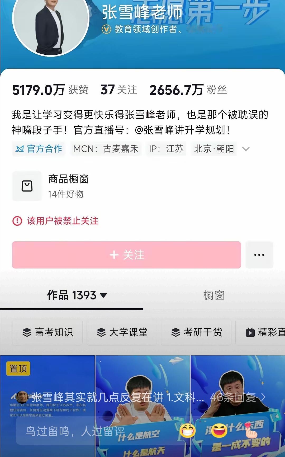张雪峰被封了?别瞎传了!去看他账号才发现,根本不是封号,是“禁止关注”——老粉还在,作品也在,就是新粉加不上了。 这波操作其实特耐人寻味。他这人说话是冲,说新闻学慎报、戳破天坑专业真相,确实动了不少靠信息差吃饭的人的蛋糕。但对普通家庭来说,他那些直白的建议,就是帮孩子避坑的指南针。团队说是直播有不当言论违了平台规,在处理了,说白了就是太敢说,把窗户纸捅得太破。 真不是替他洗,这年头敢说真话的“引路人”太少了。你觉得他这事儿是说了实话还是过了火?评论区聊聊~