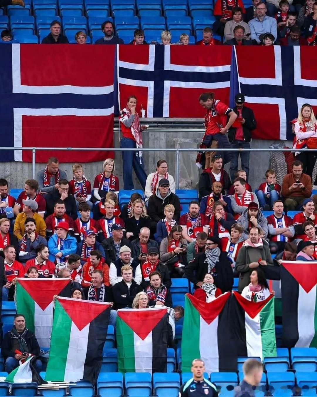 在一场具有历史意义的世界杯预选赛中,挪威国家队以五比零的悬殊比分,击败了那个被控犯下种族灭绝罪行的国家队。这场比赛中,奥斯陆球场的看台上飘扬着巴勒斯坦的旗帜 🇳🇴🇵🇸。