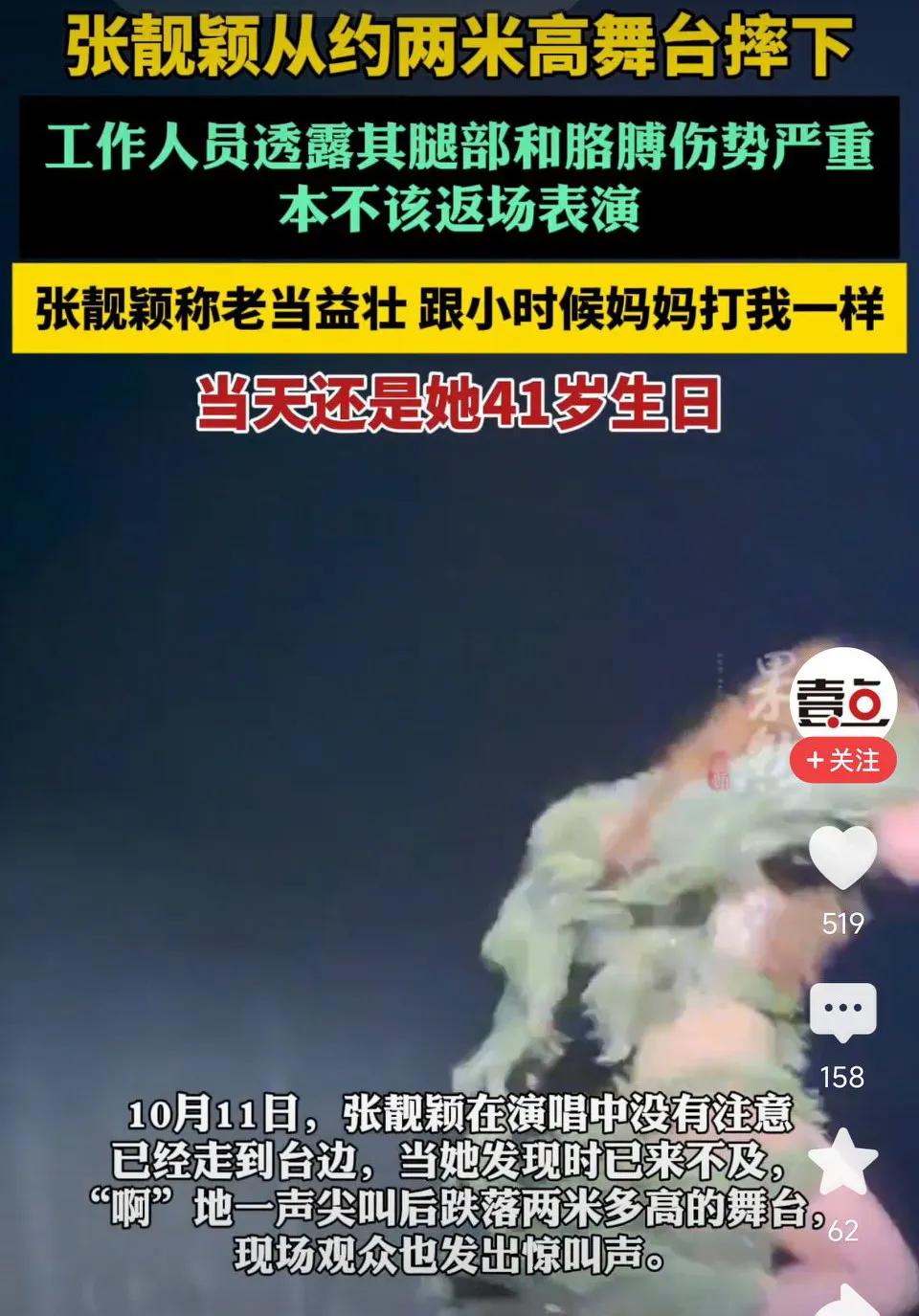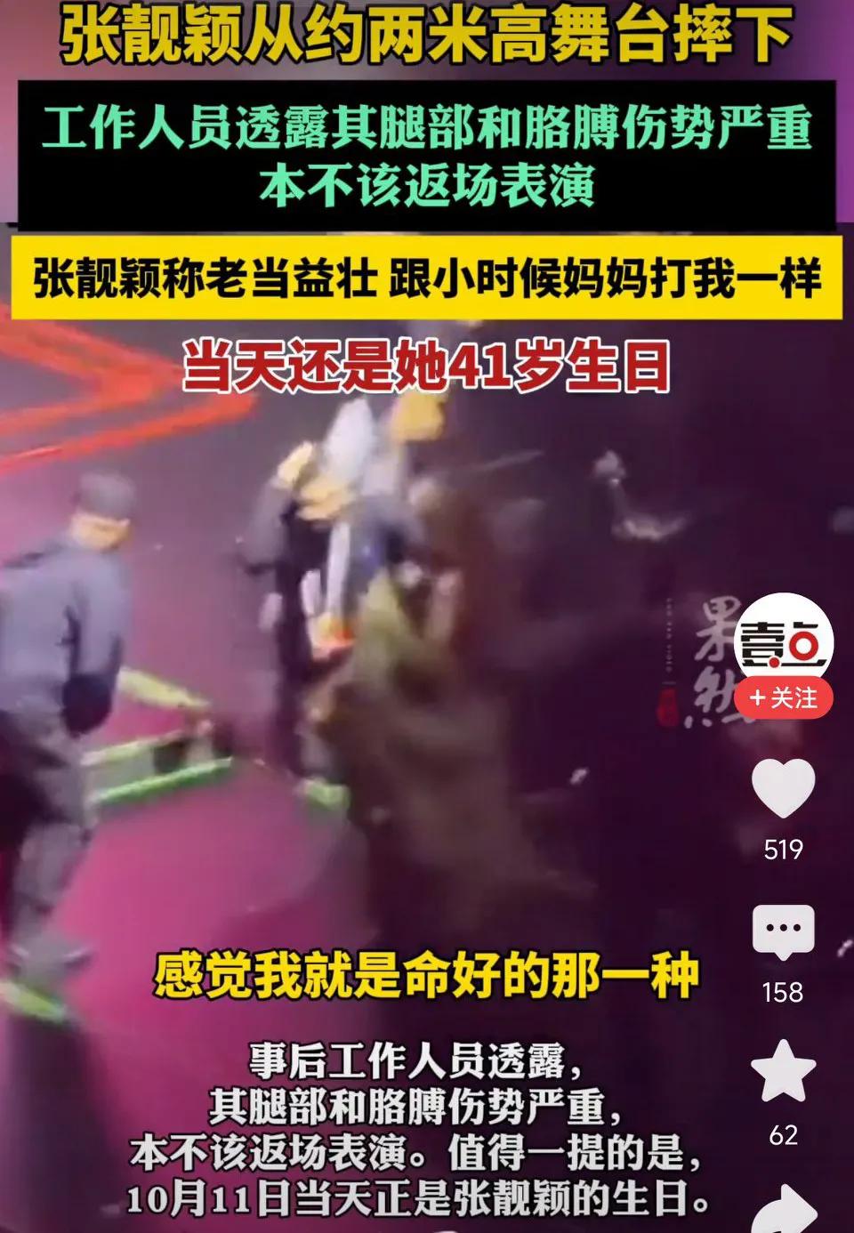 竟然有人说张靓颖摔下舞台是故意的,是吸引眼球! 这可是近2米高的舞台台阶! 我想问问说人家故意跳下来的人,这么高的地方,还穿着恨天高,你敢跳?! 张靓颖踩空摔落,摔下后,话筒没丢弃,面露笑容,继续演唱,还自嘲自已老当力壮。这敬业精神真的可以了! 黑粉就是黑粉,啥都能喷!人都受伤严重了,还说人家故意跳下来!心寒! 张靓颖