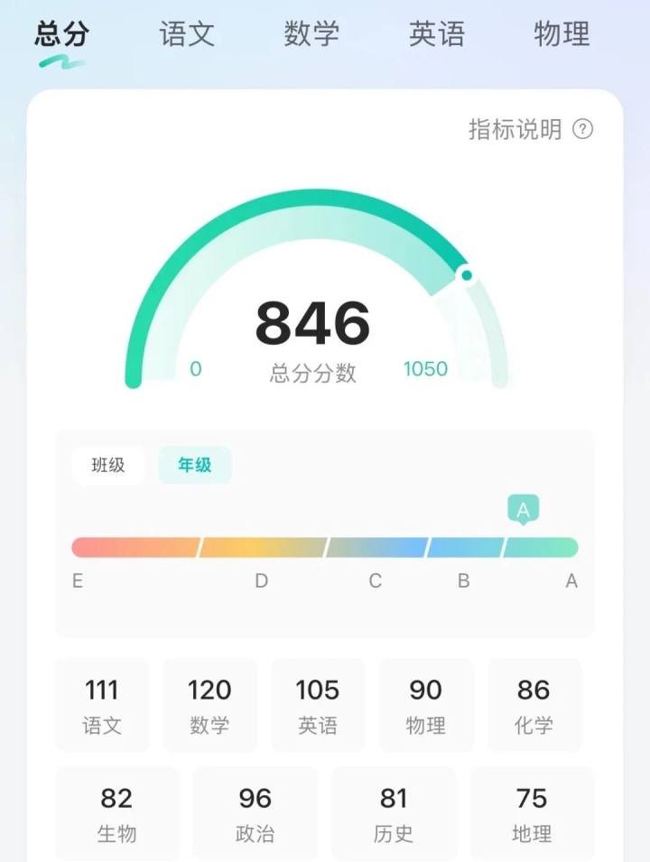 上面不仅有各科成绩,还有ABCD等不同的等第,代表在班级的水平。
