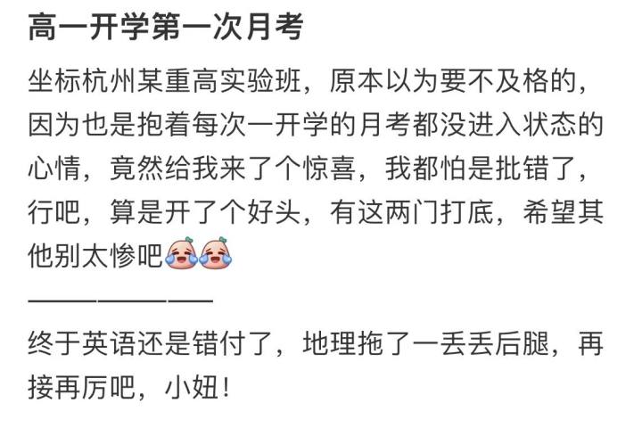 最近,杭州部分高中进行了新学期的第一次大考,还有学生在网络晒出成绩单,特别是刚开启高中生活的高一年级,不少家长和学生都在关注。