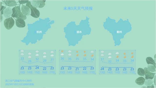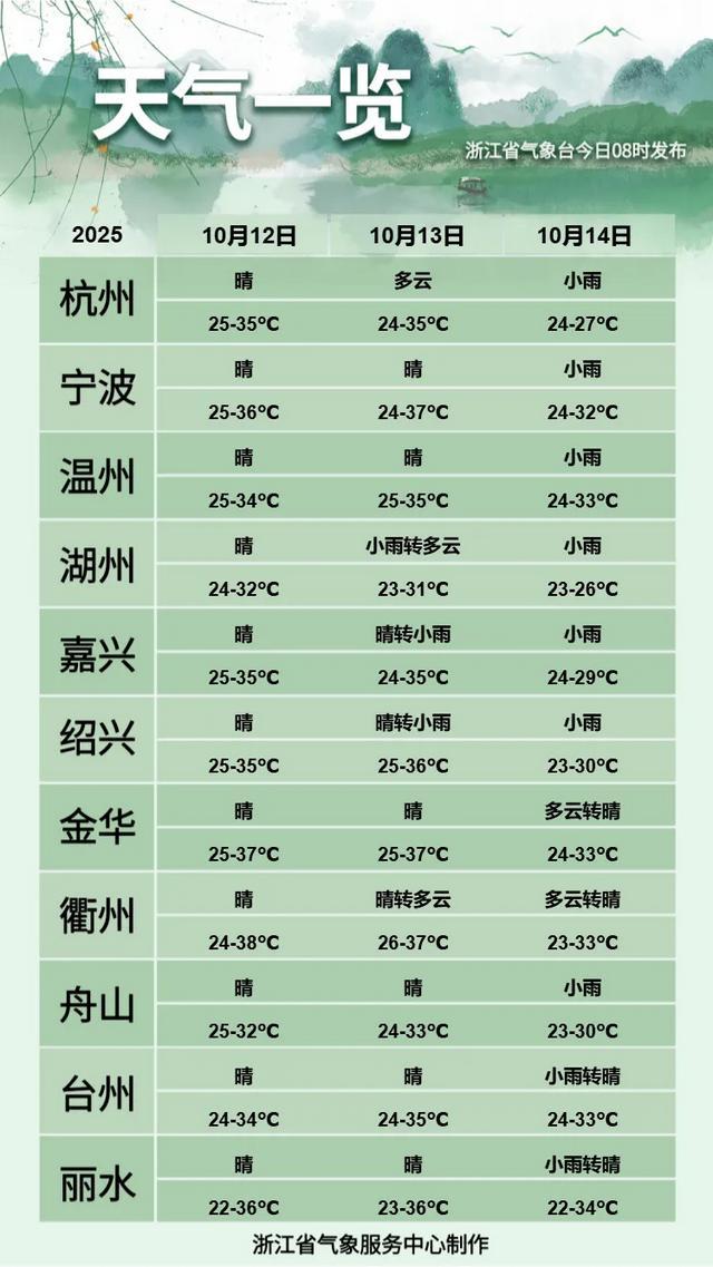 明天早晨最低温度:山区21-23℃;其他地区23-25℃。明天白天最高温度:浙西北地区28-30℃;沿海地区31-33℃;其他地区34-36℃,局部地区37℃以上。