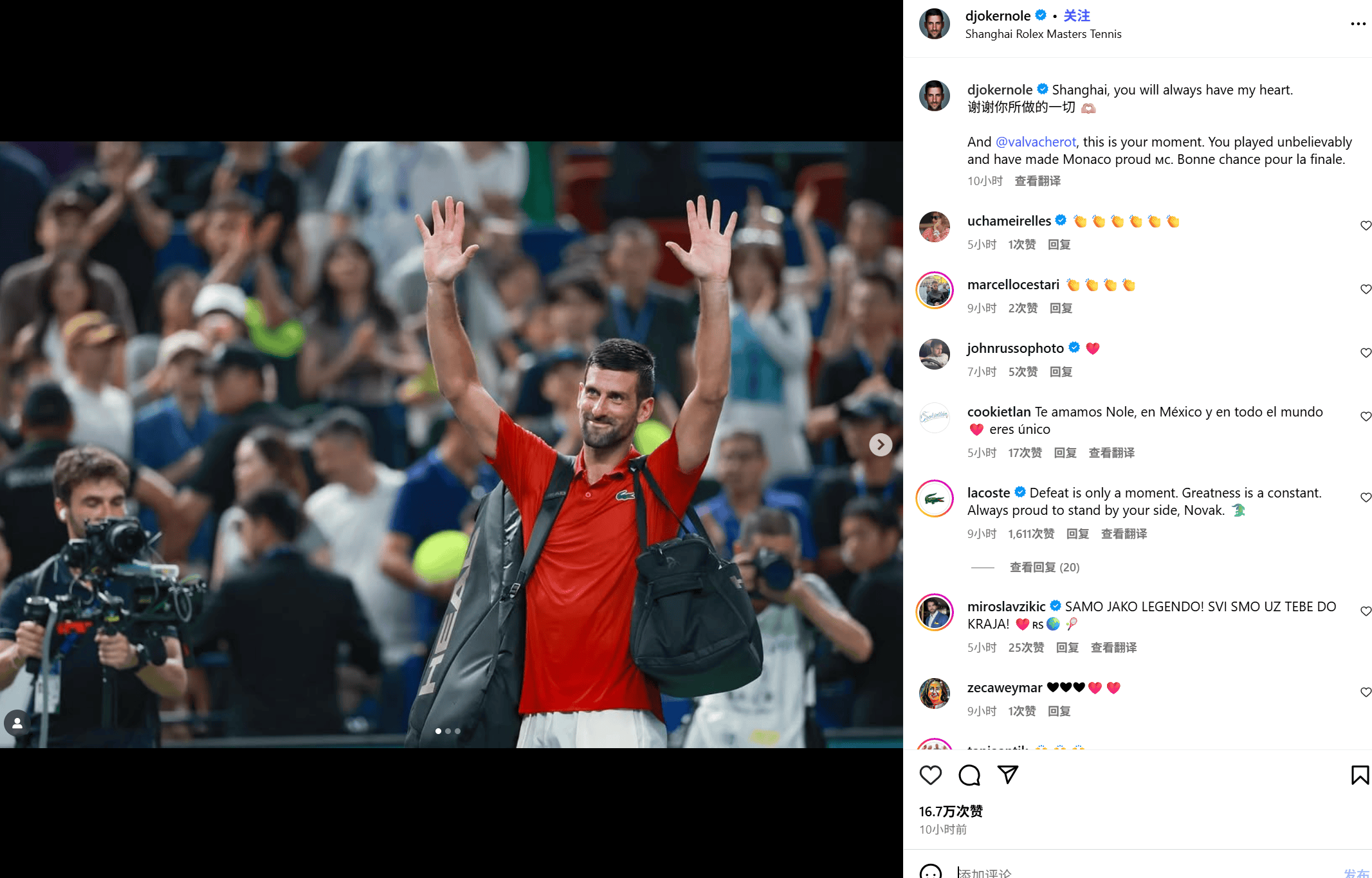 德约科维奇赛后写道:“上海,你将永远在我的心中,谢谢你所做的一切。@瓦舍罗,这是属于你的时刻,你表现得令人难以置信,也让摩纳哥为你骄傲”。