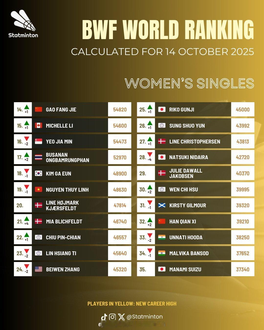 女单排名整体变化不大,前五里国羽女单占据三席!