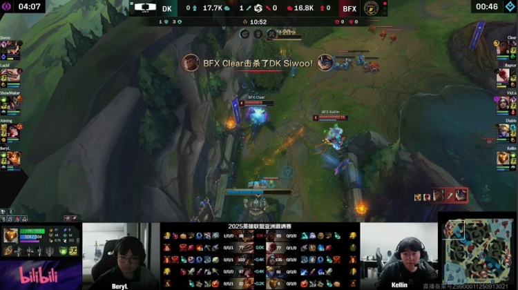 [22:10]河道团战,Raptor盲僧踢进DK人群,但Siwoo兰博上路单杀Clear奎桑提找回场子,野区正面Vicla妖姬踩掉许哥后再杀Aiming,Aiming女枪死前双杀,Lucid冥犬收割Kellin,DK打出2换5团灭BFX后拿到厄塔汗,经济领先5k。