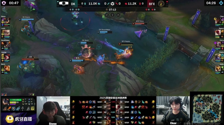 [12:30]Clear奎桑提上路线上单杀Siwoo兰博,小龙团4v4,Kellin巴德开门送队友撤退,DK追击,Lucid冥犬锁头融化Raptor,Vicla妖姬反杀Lucid,BFX整体打出1换2,经济落后1k。DK连拿两条小龙,本局为火龙魂。