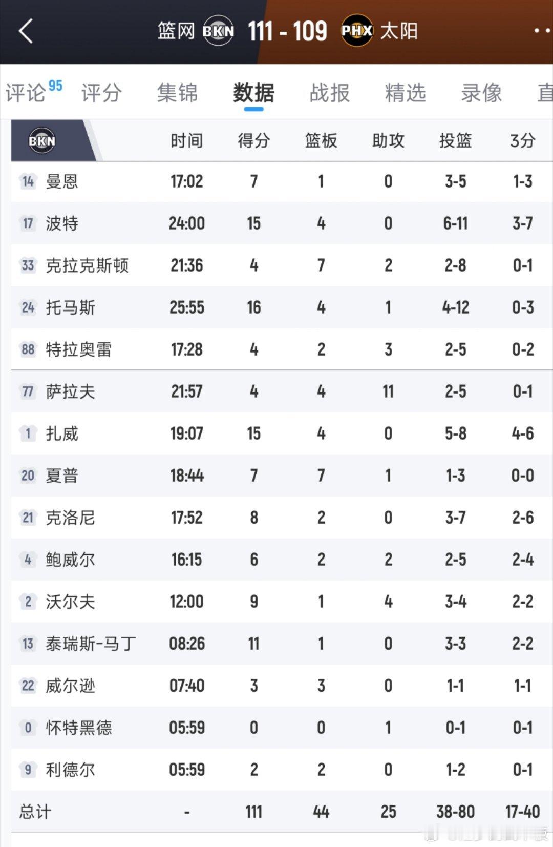 曾凡博没有登场!泰雷斯-马丁罚球准绝杀,中国赛二番战篮网111-109战胜太阳。