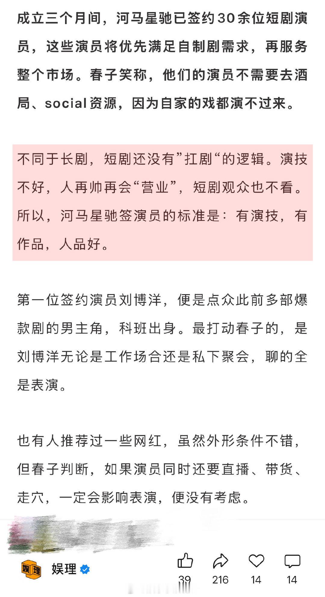 业内称短剧演员演长剧的意愿不高 短剧男演员想和刘萧旭合作 短剧没有”扛剧“的逻辑。演技不好,人再帅再会“营业”,短剧观众也不看。一些网红虽然外形条件不错,但如果同时还要直播、带货、走穴,一定会影响表演。签短剧演员也要背调,否则会涉及短剧下架,牵连平台。“背调是必须的,涉及红线的绝对不行。”娱理独家↓