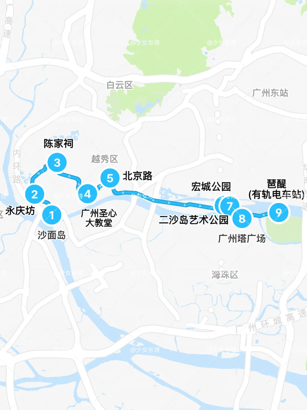 🚗交通:从广州塔广场步行至广州塔有轨电车站,乘坐有轨电车