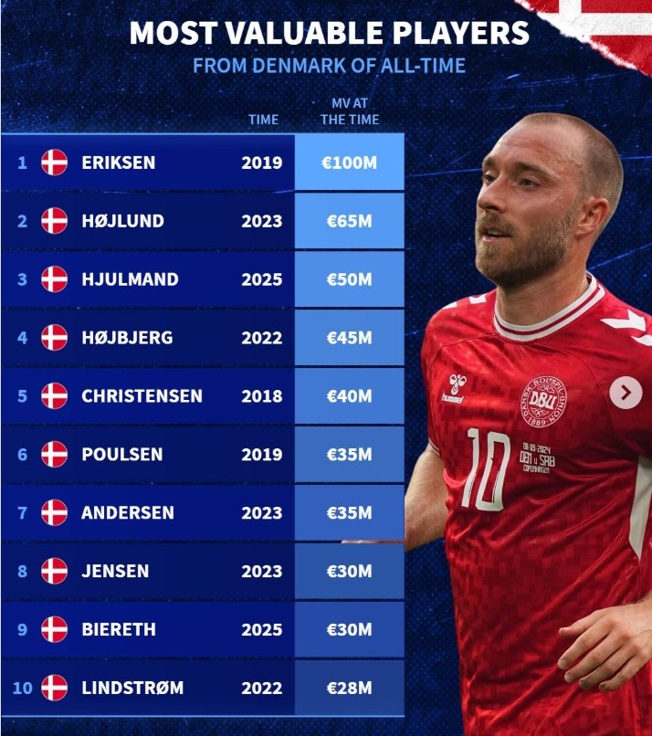 直播吧10月13日讯德转统计了丹麦球员历史身价榜,埃里克森1亿欧位列第一。