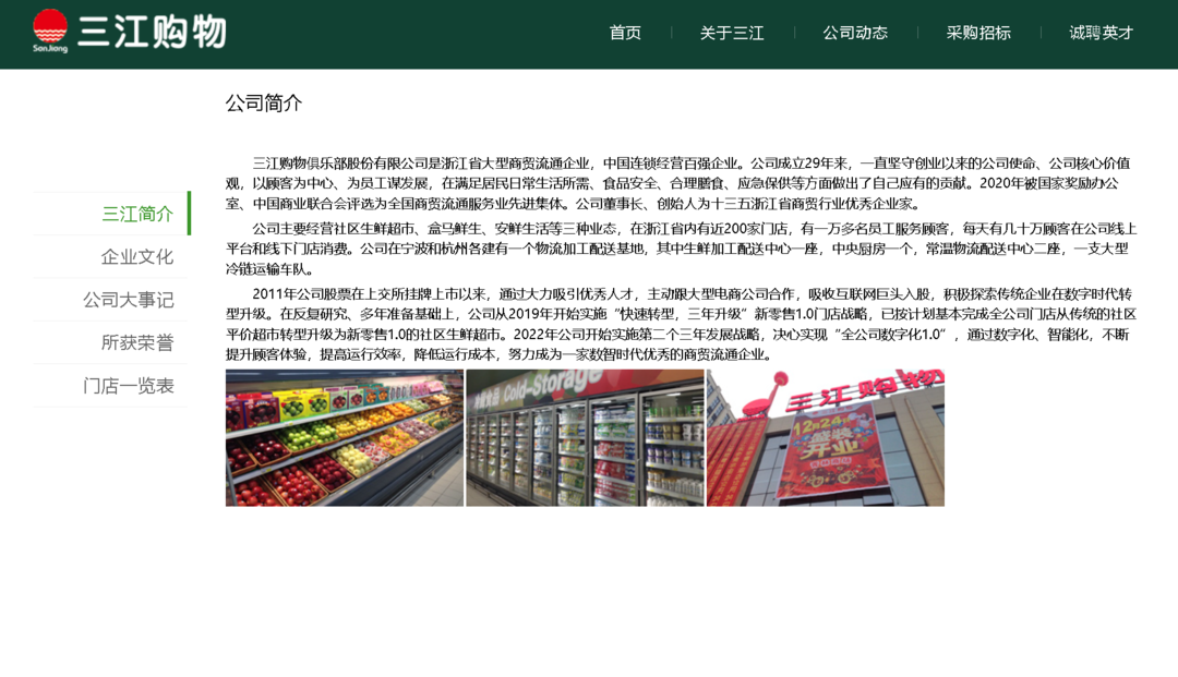 三江购物俱乐部股份有限公司是浙江省大型商贸流通企业,中国连锁经营百强企业。2020年被国家奖励办公室、中国商业联合会评选为全国商贸流通服务业先进集体。公司董事长、创始人为十三五浙江省商贸行业优秀企业家。