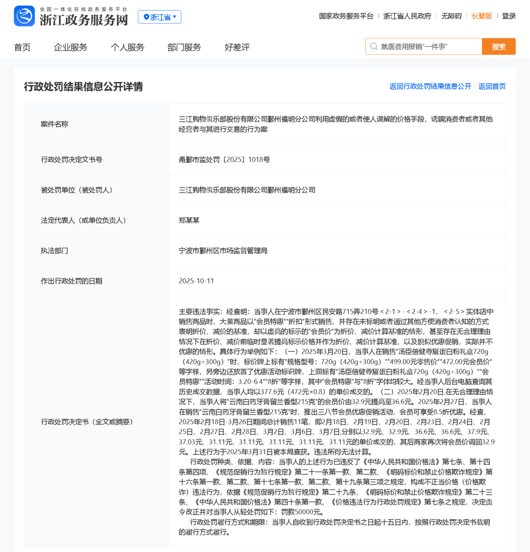 近日,齐鲁晚报·齐鲁壹点记者从浙江政务服务网获悉,三江购物俱乐部股份有限公司鄞州福明分公司因利用虚假的或者使人误解的价格手段,诱骗消费者或者其他经营者与其进行交易的行为案,被宁波市鄞州区市场监督管理局罚款50000元。