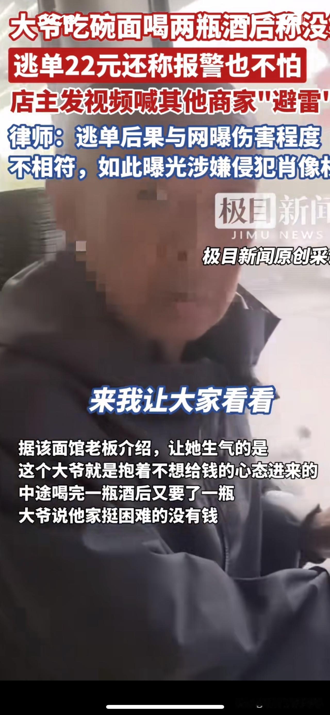 这种要是算侵权,这真是给耍无赖的一种保护!一个饭馆的女老板曝光了一个老大爷吃了人家二十二元的霸王餐,吃完喝完抬起屁股就走人,走的那么理直气壮去!老板要钱,他说没钱,你报警我也不怕,你说这事搁在谁的身上不气人、 店主发了一个视频喊其他店主避雷,有律师发话了,店家涉嫌侵犯肖像权,这倒是谁侵权? 老板娘一开始态度也是特别好,如果你一开始没有钱可以给我说一声,给你下一碗面条也无所谓,这个无耻的老人道好,还要了两瓶小酒,然后吃完喝完就拍拍屁股走人! 你是明摆着吃霸王餐,商家拿着这种老油条老无赖也没办法,就算报警也是协商解决,超过七十岁了,就连帽子叔叔也是无语,拘又拘不了换作哪个店家谁也没有时间瞎折腾! 老板也没有侮辱贬损的言论,也没有捏造事实的情况,主要曝光大爷吃霸王餐的这种可耻行为,避免其他商家遭遇这种事情,这种还怎么就成了侵犯肖像权了呢?要是这样的话只会出现社会无赖越来越多! 是律师你说的对,为什么全网的人都在问候你呢,因为你的话会助长这种丑陋人行为更恶劣,他脸面都不要了,都不怕丢人了,这种人还要什么肖像权,如果没人管,没人问,是不是行为越来越嚣张, 这次坐等后续了,当地的社区,和帽子叔叔该出手了!