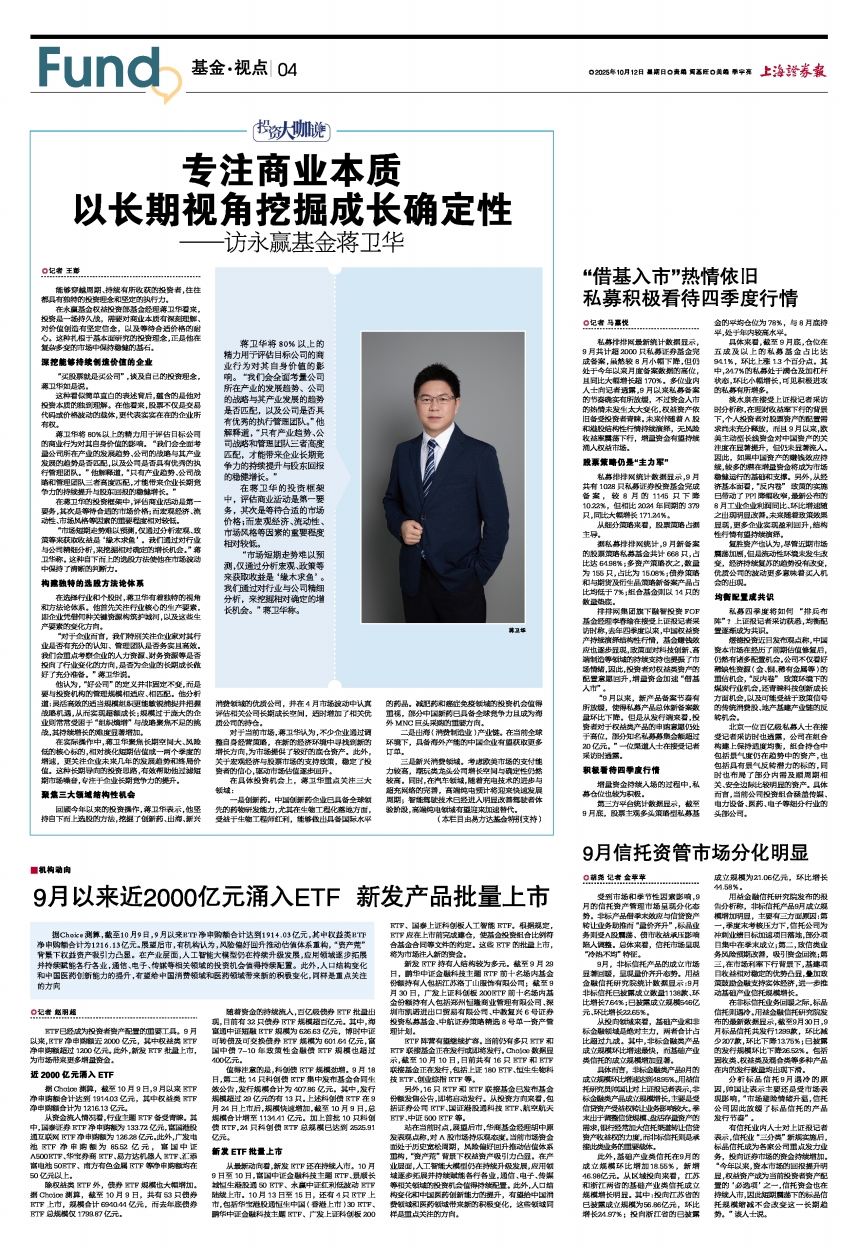 淡水泉在接受上证报记者采访时分析称,在理财收益率下行的背景下,个人投资者对股票资产的配置需求尚未充分释放,而且9月以来,欧美主动型长线资金对中国资产的关注度在显著提升,但仍未显著流入。因此,如果中国资产的赚钱效应持续,较多的潜在增量资金将成为市场稳健运行的基础和支撑。另外,从经济基本面看,“反内卷”政策的实施已带动了PPI降幅收窄,最新公布的8月工业企业利润同比、环比增速随之出现明显改善。未来随着政策效果显现,更多企业实现盈利回升,结构性行情有望持续演绎。