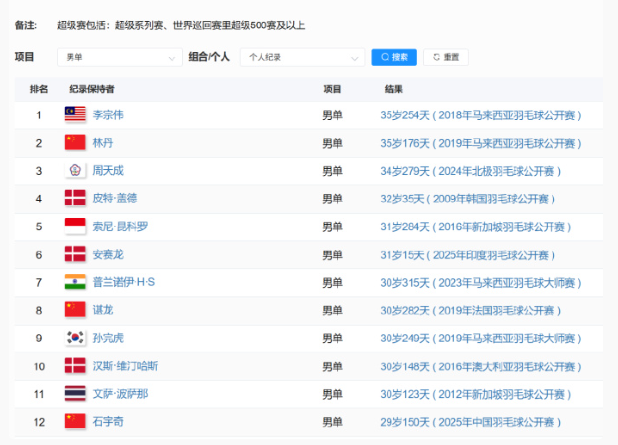 男单冠军!打破了尘封7年之久的(超级系列赛/超级500赛及以上级别)最年长男单冠军纪录![憧憬] 1.(TPE) 周天成 (35岁277天 2025年北极公开赛) 2.🇲🇾 李宗伟 (35岁254天 2018年马来西亚公开赛) 3.🇨🇳 林丹 (35岁176天 2019年马来西亚公开赛) 4.🇩🇰 皮特·盖德 (32岁35天 2009年韩国公开赛) 5.🇮🇩 索尼·昆科罗 (31岁184天 2016年新加坡公开赛) 6.🇩🇰 安赛龙 (31岁15天 2025年印度公开赛)