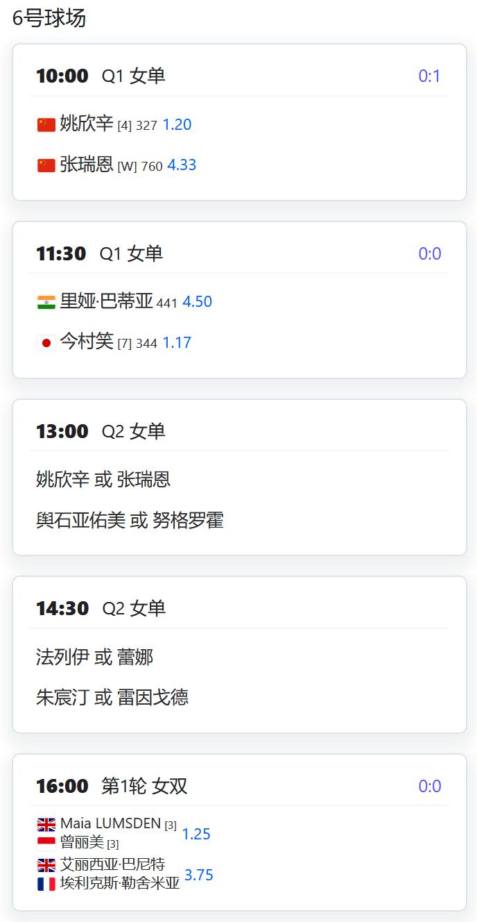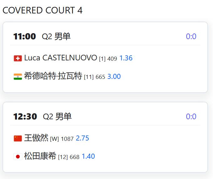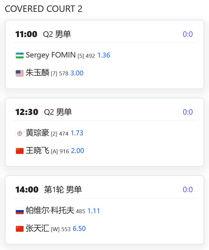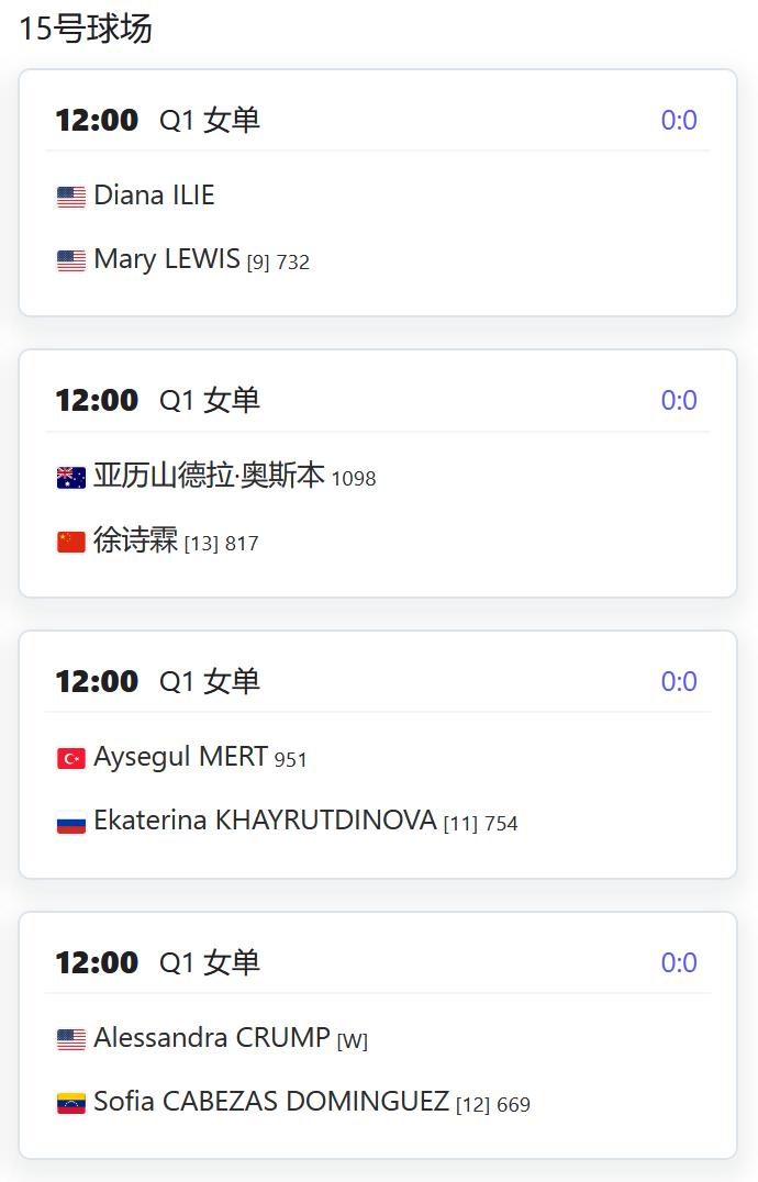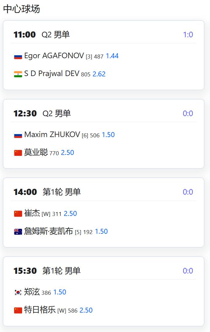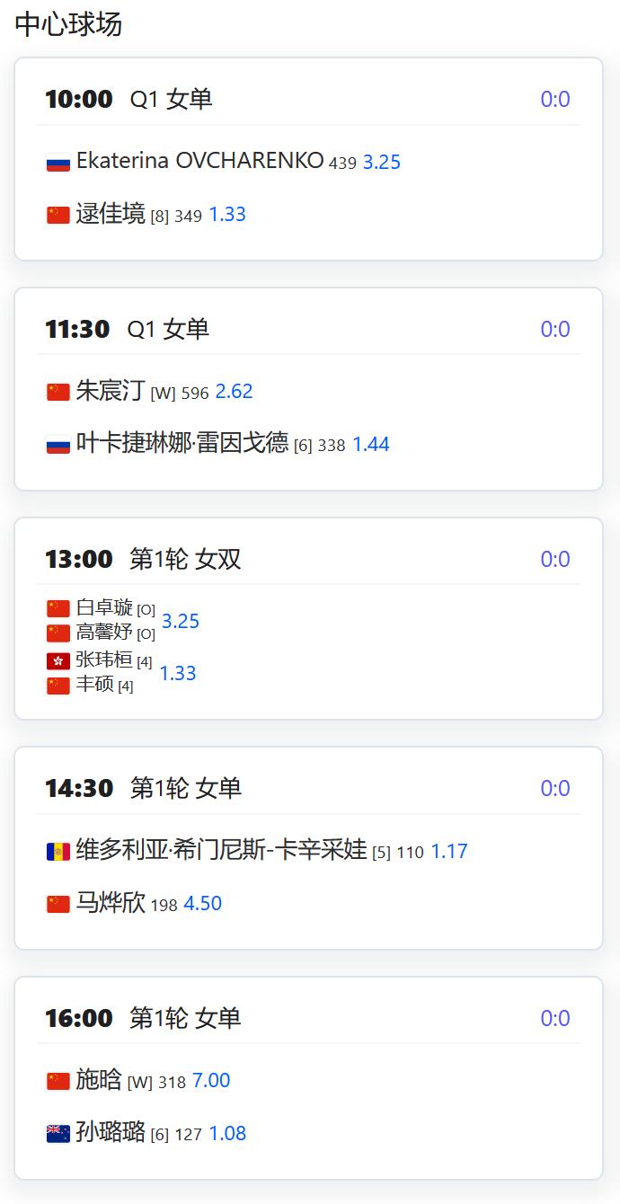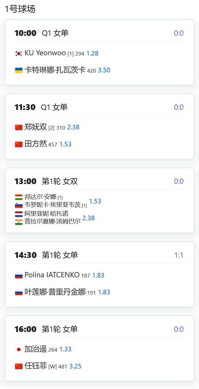 今日赛程: WTA500赛宁波站,女单第一轮,持外卡参赛的王曦雨将在中心球场夜场对阵7号种子施耐德; 女双第一轮,张帅/万卓索娃将对阵汤千慧/艾克里; W125济南,受天气影响,女单资格赛首轮将在今天补赛,决赛轮也将同日进行; 女单第一轮,马烨欣将对阵5号种子卡辛采娃; 施晗将对阵6号种子孙璐璐; 任钰菲将对日本球员加治遥; W100梅肯,女单资格赛第一轮,徐诗霖将对阵澳大利亚的球员奥斯本; W100 Les Franqueses Del VallÈs,田嘉琳将与外卡球员罗德里格斯争夺一个正赛席位; CH75深圳,男单资格赛第二轮,莫业聪将与祖科夫争夺一个正赛席位; 王晓飞将与2号种子黄宗豪争夺一个正赛席位; 王傲然将与12号种子松田康希争夺一个正赛席位; 男单第一轮,崔杰将对阵5号种子麦凯布; 特日格乐将对阵韩国球员郑泫; 张天汇将对阵俄罗斯的科托夫。
