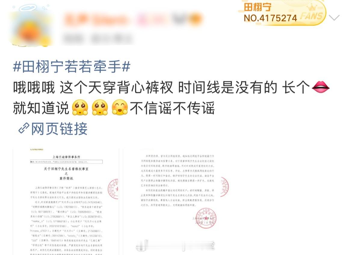 田栩宁曾明确自己单身,现在被媒体拍到和若若牵手后,粉丝们纷纷表示不信,因为媒体没有给出具体的时间……如果是单身声明前拍到的,那怎么说,不算数吗?