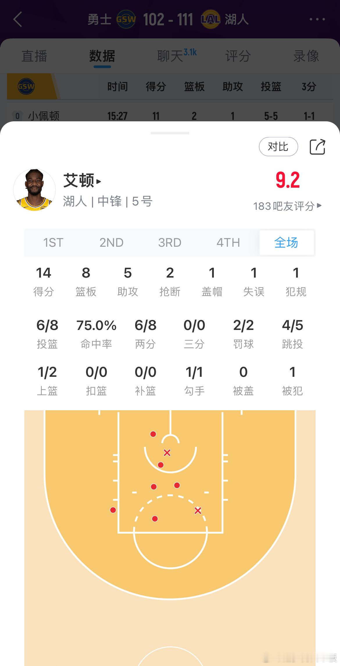 中投小王子✅艾顿本场出战26分钟,投篮8中6得到14分8篮板5助攻,同时还有2断1帽