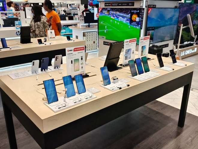 观察者网在现场走一圈发现,苹果新旗舰手机iPhone17系列已在这里上架,而中国品牌的高端机型也百花齐放。比如华为Pura80系列、双折叠MateX6,三折叠MateXT、13.2英寸的MatePadPro,荣耀折叠屏MagicV5,OPPO折叠屏FindN5,小米15系列等等。
