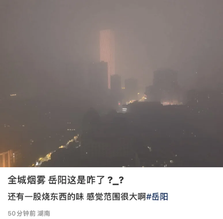 12日晚,湖南岳阳突发“烟雾锁城”现象。多位网友发布视频表示:岳阳全城被烟雾弥漫,“有烧东西的味道”。有目击者称烟味很大让人头晕,很多人咳嗽。