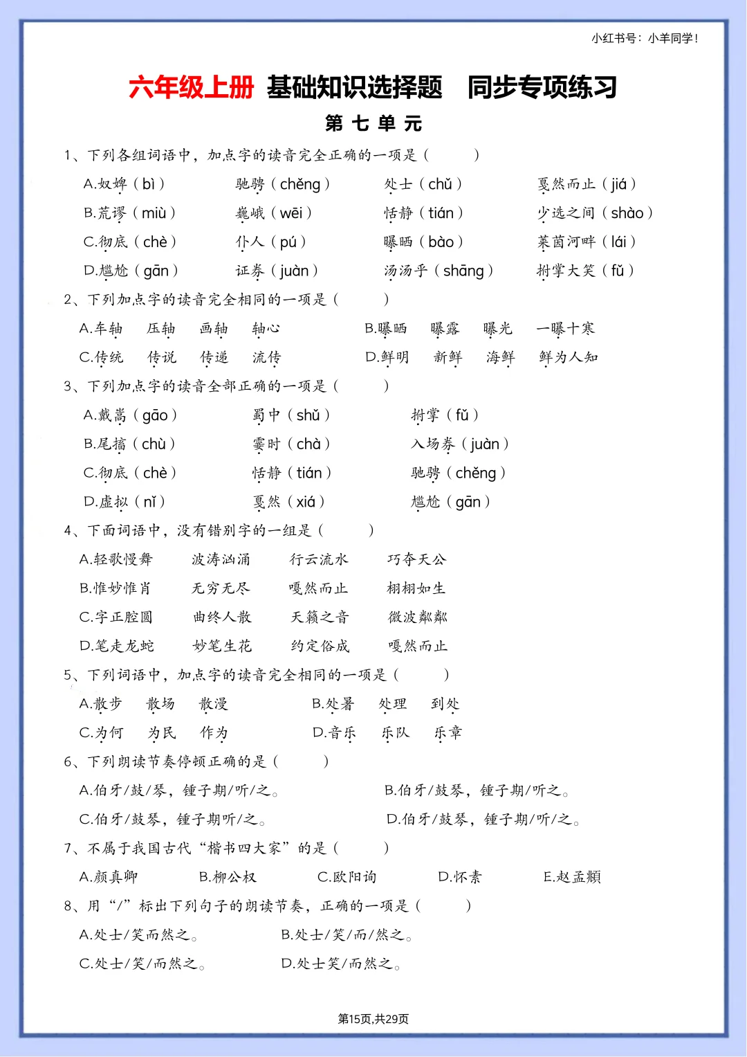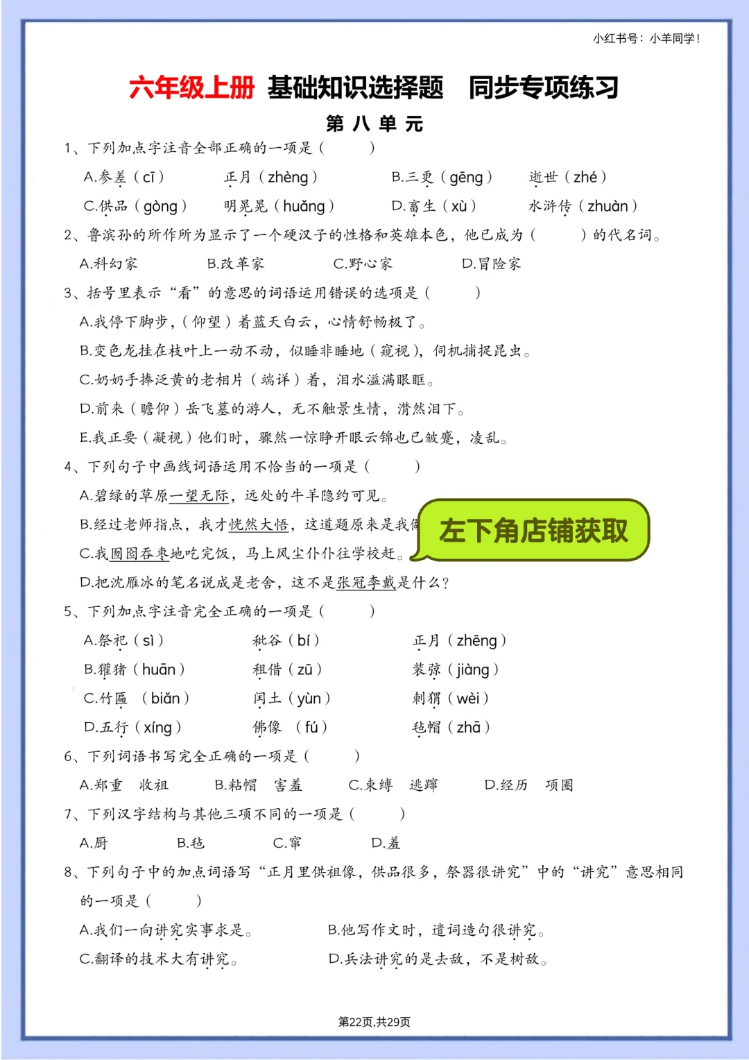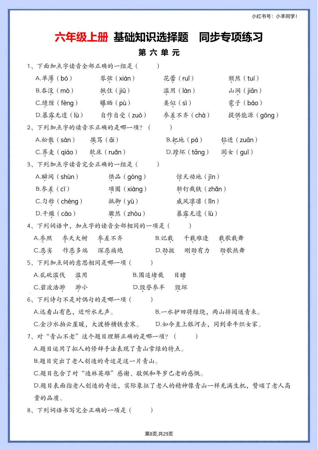最新整理的六上【基础知识选择题专项训练】终于搞定啦!