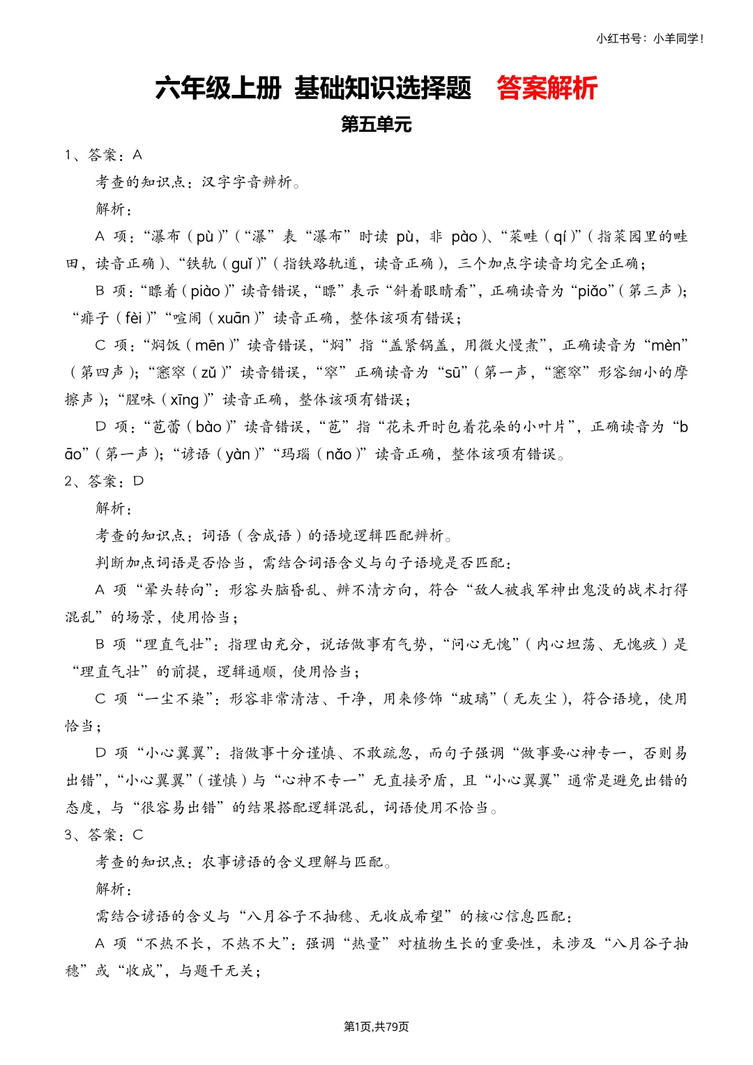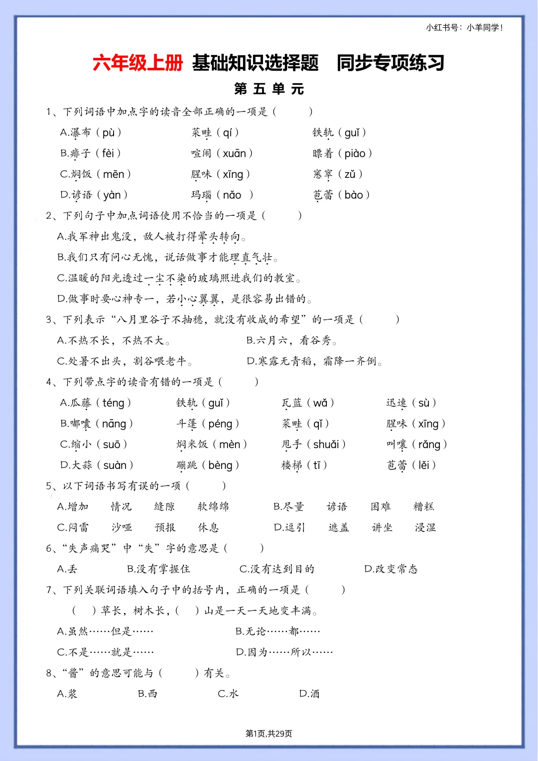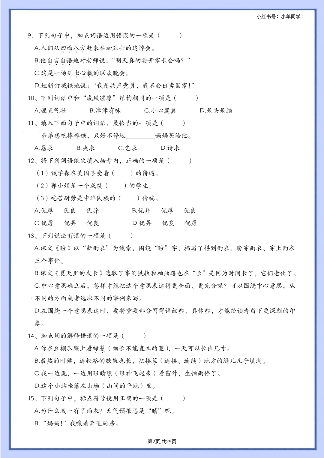 ✅ 别看是选择题,考查范围真的巨广!字音字形、标点符号、拼音练习、诗句理解、修辞手法、口语交际、修改病句、词句段运用、词语辨析、课文理解、句式转换、词语搭配、名句运用、关联词…… 基础知识点几乎全涵盖,一套练透超省心!