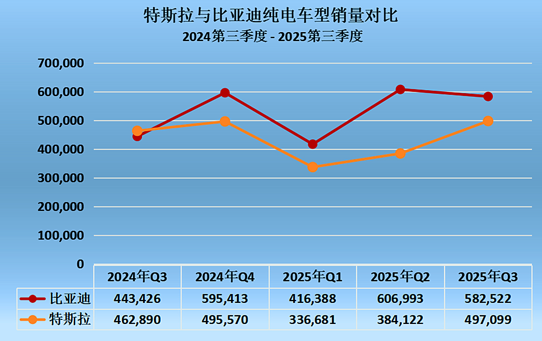 据相关数据显示,在2025年前三个季度,比亚迪新能源汽车(NEV)整体销量达326万台。其中纯电车型占比为49.26%,销量近160.6辆,仅在刚刚过去的2025第三季度,其纯电车型销量就达到了582522辆。 相比之下,目前唯一能与比亚迪在销量上掰掰手腕的特斯拉,已连续四个季度落后于比亚迪(见图3),仅在2025第三季度期间,两者就相差85423辆。而在今年前三个季度,比亚迪海外销量突破70万辆。有数据显示(见图4),仅在今年8月份期间,比亚迪多个国家及地区持续扩大领先态势,销量均超过了特斯拉。不出意外的话,比亚迪的2025年全球纯电销冠头衔或成定局。