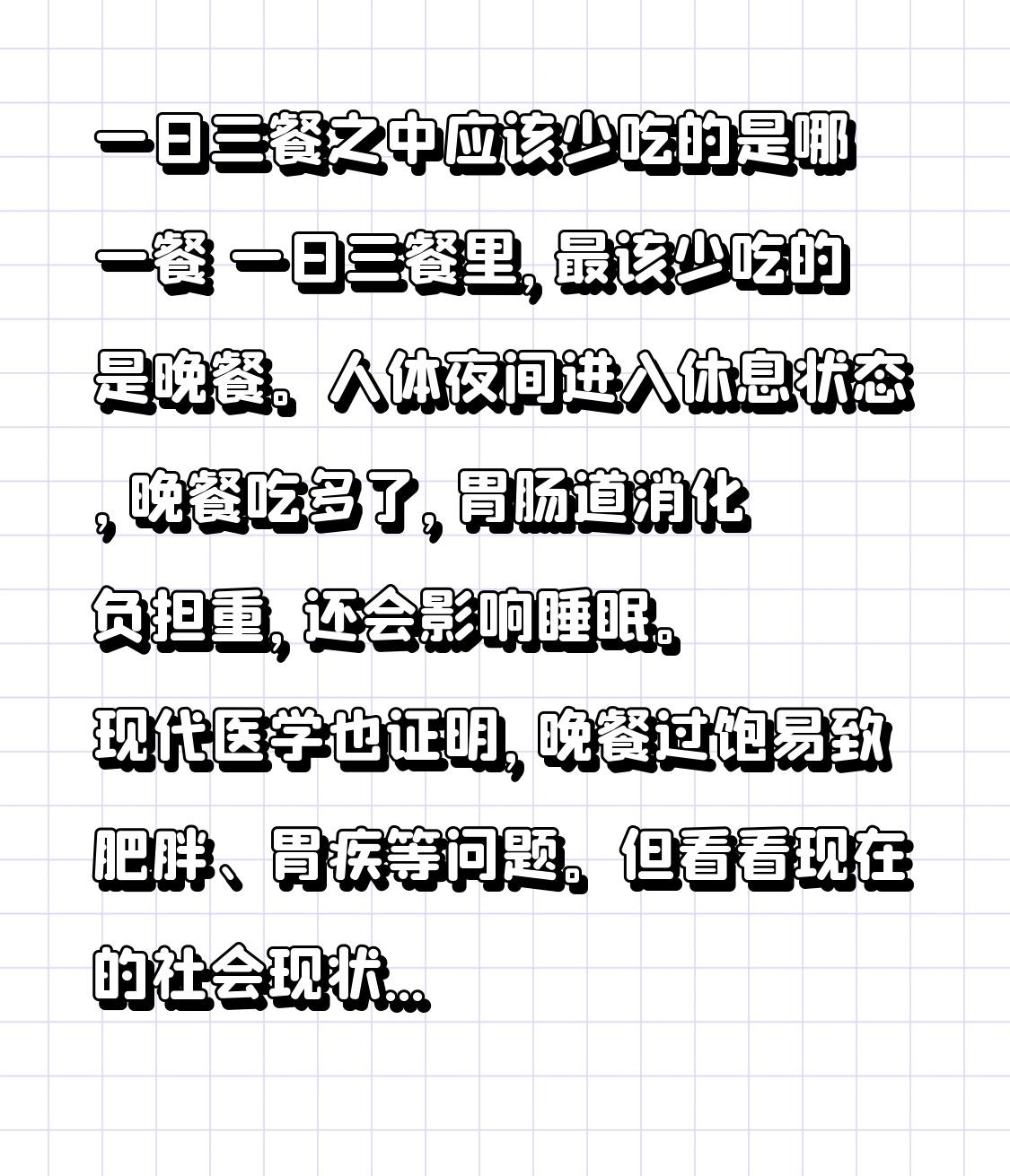 一日三餐之中应该少吃的是哪一餐 一日三餐里,最该少吃的是晚餐。人体夜间进入休息状态,晚餐吃多了,胃肠道消化负担重,还会影响睡眠。现代医学也证明,晚餐过饱易致肥胖、胃疾等问题。 但看看现在的社会现状,早上随便啃个面包,中午凑合吃个盒饭,到了晚上却呼朋唤友,火锅烧烤大鱼大肉吃到深夜。这种吃法完全违背养生之道,怪不得医院里肠胃病人越来越多。其实晚餐吃到六七分饱就行,既能减轻身体负担,又能避免很多健康问题。大家可别只贪图口腹之欲,还是要多为健康着想。