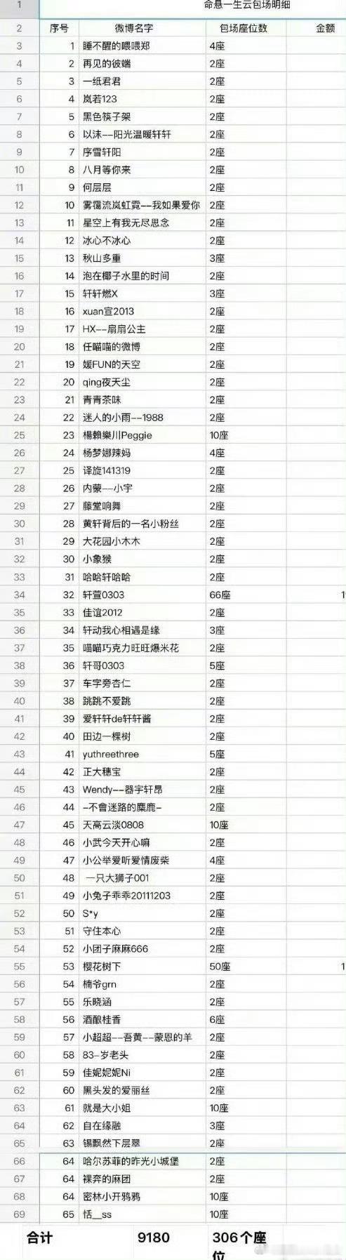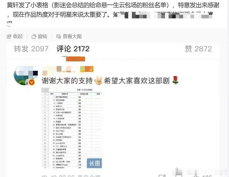 黄轩发了后援会总结的给命悬一生云包场的粉丝的名单,感谢粉丝。知名度高但是流量不够高的实力演员,在面对影视寒冬,确实也不容易,命悬一生我觉得还可以,剧情制作都不错,问题不在他,这部剧好多yzk啊