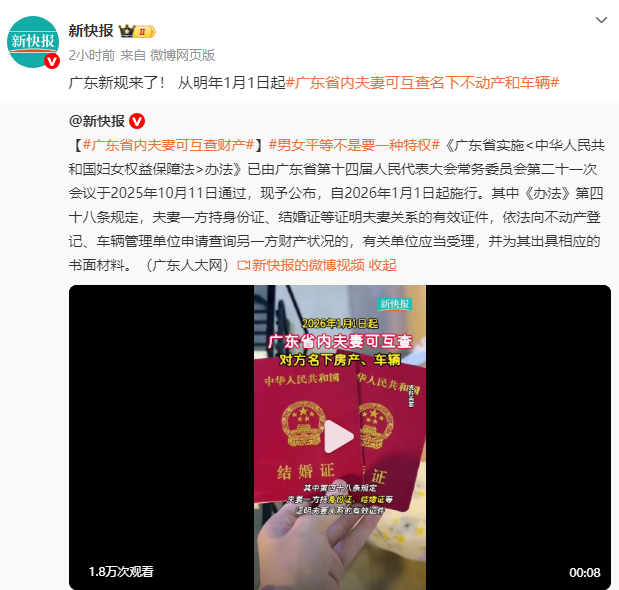 其中《办法》第四十八条规定,夫妻一方持身份证、结婚证等证明夫妻关系的有效证件,依法向不动产登记、车辆管理单位申请查询另一方财产状况的,有关单位应当受理,并为其出具相应的书面材料。(广东人大网、新快报微博)