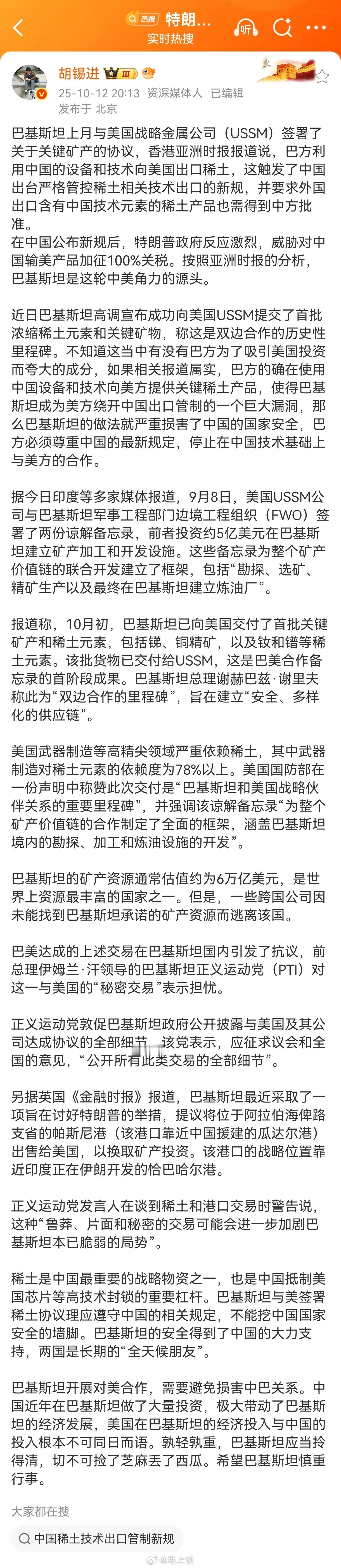 中方回应巴基斯坦向美国赠送稀土 老胡:尴尬,刚刚写了万字长评,这不毁我么…[二哈