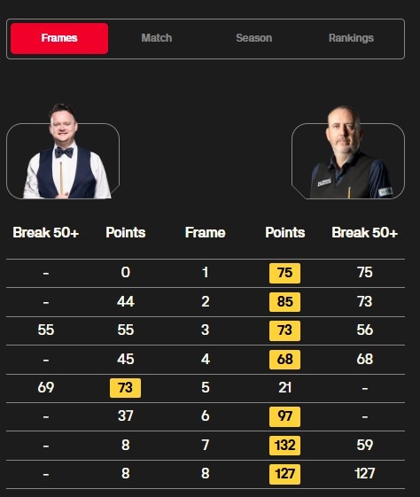 马克-威廉姆斯打出一杆破百(127)和五杆50+(75、73、56、68、69),肖恩·墨菲打出两杆50+(55、69)。