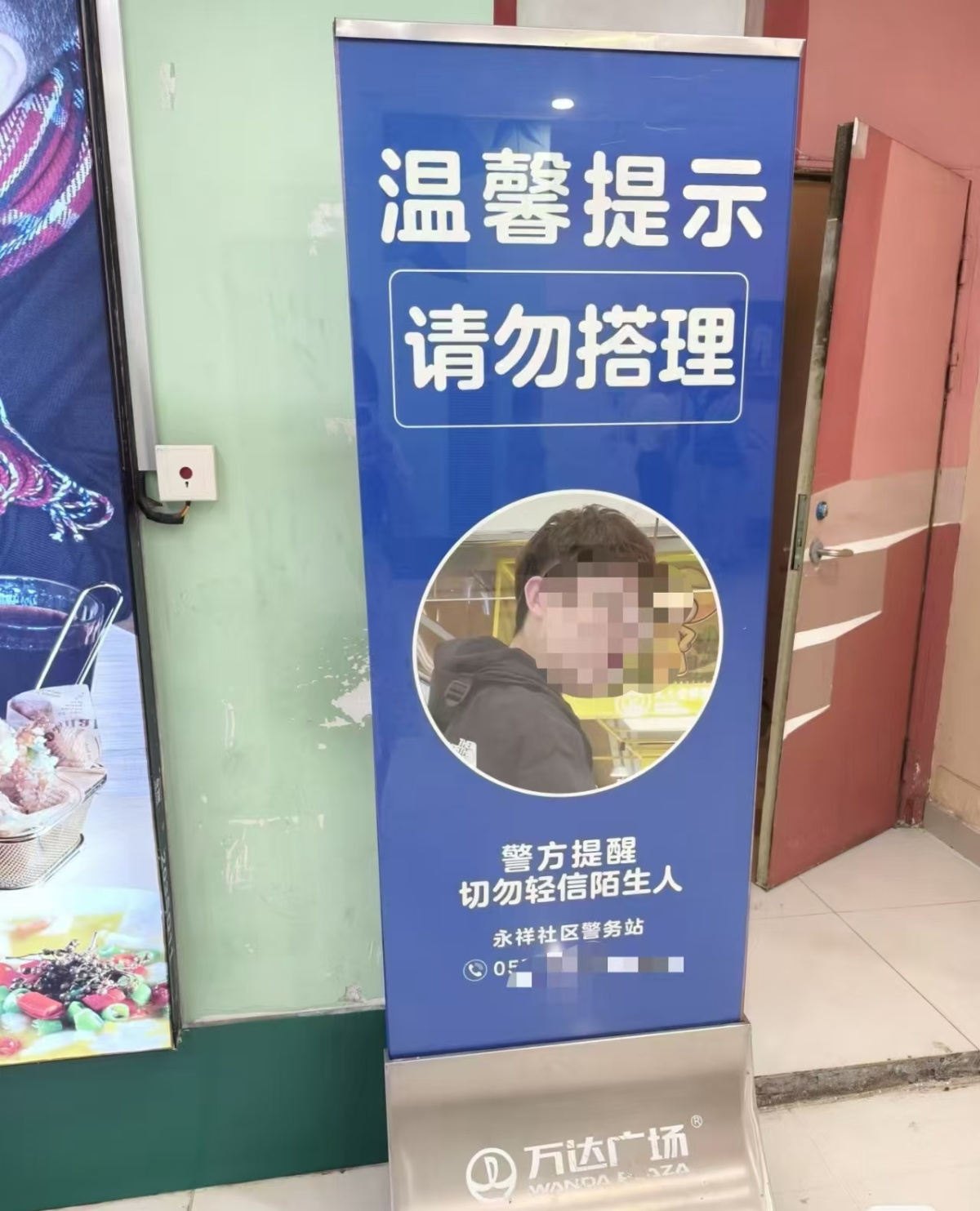 近日,浙江义乌万达广场一提示牌引发关注,提示牌上张贴一男子的照片,并被标注“请勿搭理”“警方提醒切莫轻信陌生人”并附有永祥社区警务站电话。