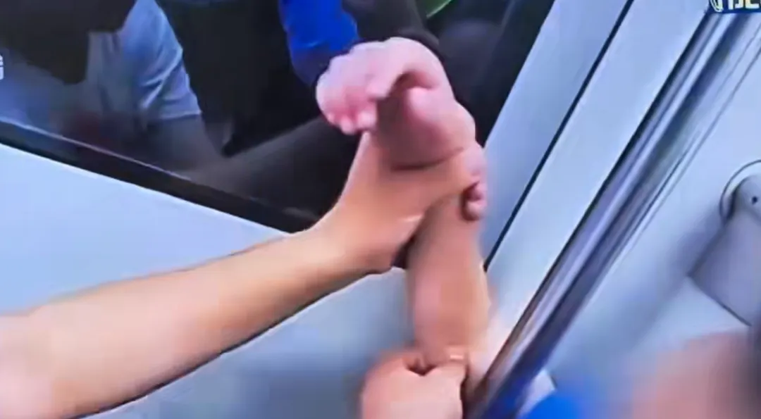 2024年,北京地铁6号线列车上,一名调皮的孩子将手臂卡在了车门扶手杆的缝隙中。