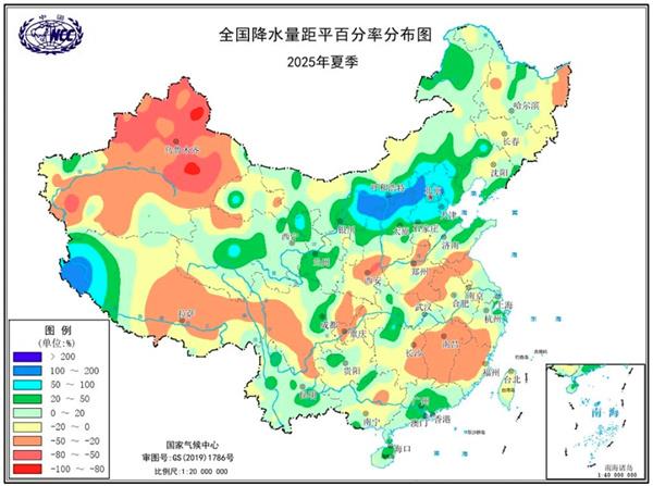 气温高的同时,一些地方降雨也偏少。今年夏季,中东部地区降雨总体呈现“南北多、中间少”分布,华东北部和南部、华中东部等地偏少2至8成。