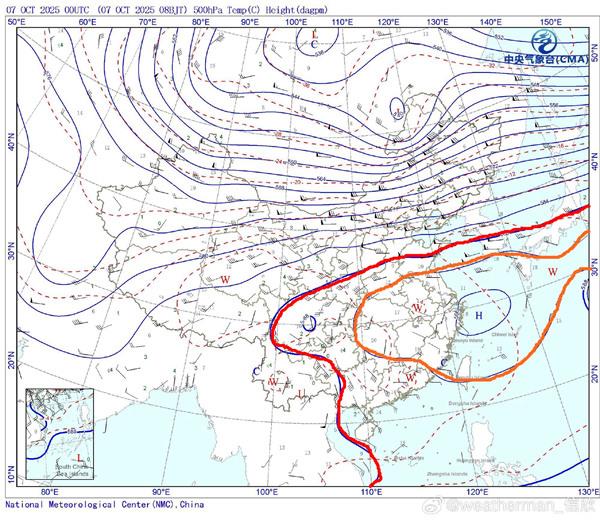 10月7日,副热带高压强得离谱,代表副热带高压的588线(图中红线)北界在甘肃南部至山东中部一带,592线(图中橙线)更是控制了福建、浙江、上海、江苏、安徽、湖北、湖南、江西等地。