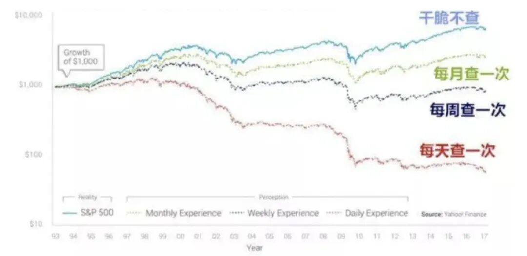 最上方的蓝线是标准普尔500指数23年来的实际走势,下面3条虚线是投资者不同查询频率所获得的收益曲线。如果投资者从来不查询净值,只在23年后看了一眼结果,收益率差不多能达到700%。而查净值的频率越高,收益率就越低,如果每天查一次,那结果就很惨了。
