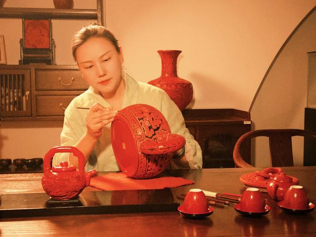 从小学习素描、油画的刘翰音,大学读了商科。2017年,偶然看见的一件剔红作品点燃她深埋心底的艺术热情,让事业稳定的她决心转型非遗传承。2018年春节,她赴京拜师殷秀云,先做帮工打下基础,经一年考验获师父认可,正式习得雕漆技艺。