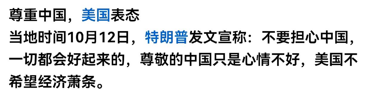 特朗普想打退堂鼓,又遮遮掩掩。特朗普威胁东方龙,没想反倒是美国自己遭了秧,回过神来贸易代表迅速电话打给东方龙,可是东方龙这边就是不接,搞得美方的焦虑达到了顶点。那怎么办呢?唯一的出路就是:跪下认错。这不,特朗普发了个含糊不清的,既隐含道歉意味,又不想放下面子文,说白了就是下跪想认错,但又遮遮掩掩。 据报特朗普在发文前,与副总统进行了沟通,内部达成了一致意见:加速缓和中美关系;美对中国非常尊敬;高度赞赏中美友谊。这明摆着是要跪的节奏嘛。 再解析特朗普发的文言外之意:不要担心中国(甘拜下风,不准备惹怒龙哥),一切都会好起来(已有跪的方案,龙哥你不要打了),尊敬的中国只是心情不好(龙哥消消气,万不可再发怒),美国不希望经济萧条(美已经打不起经济战了,求龙哥高抬贵手)。 特朗普既然要认错,又何必遮遮掩掩呢?。特朗普发文认怂 特朗普经济困局