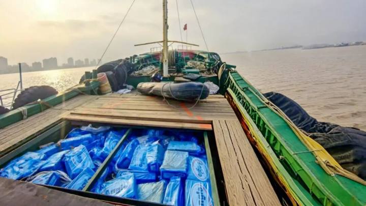 经过4小时追缉,嫌疑船终于“入网”。执法员果断行动,迅速控制现场,一举查获全英文包装的走私冻品116.2吨,抓获以符某为首的6名嫌疑人。海上初战告捷,然而,这场看似顺利的抓捕,仅仅只是揭开了整个走私迷局的冰山一角。